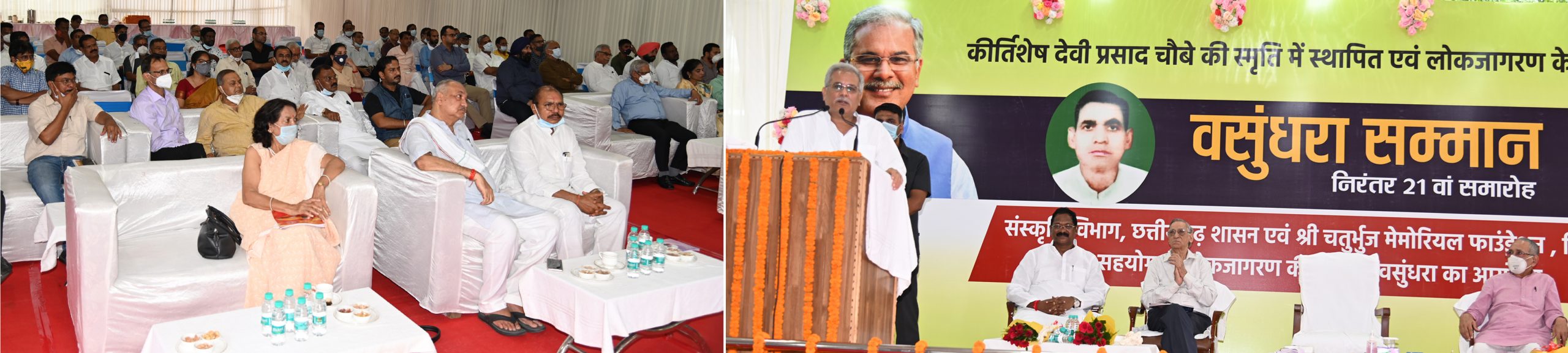 मुख्यमंत्री श्री बघेल ने आज यहां अपने निवास कार्यालय में लोक जागरण पत्रिका की ओर से स्वर्गीय देवी प्रसाद चौबे की स्मृति में आयोजित 21वें वसुंधरा सम्मान समारोह को सम्बोधित कर रहे थे। समारोह का आयोजन संस्कृति विभाग एवं श्री चतुर्भुज मेमोरियल फाउंडेशन के सहयोग से किया गया । मुख्यमंत्री ने अवसर पर सुप्रसिद्ध साहित्यकार एवं पत्रकार श्री सतीश जायसवाल को प्रशस्ति पत्र शाल एवं श्रीफल भेंट कर 21 वें वसुंधरा सम्मान से सम्मानित किया। उन्होंने समारोह मे लोकजागरण की मासिक पत्रिका ‘वसुंधरा’ के 58 वें तथा कला, साहित्य, संस्कृति की मासिक पत्रिका ‘बहुमत’ के 109वें अंक का लोकार्पण किया।