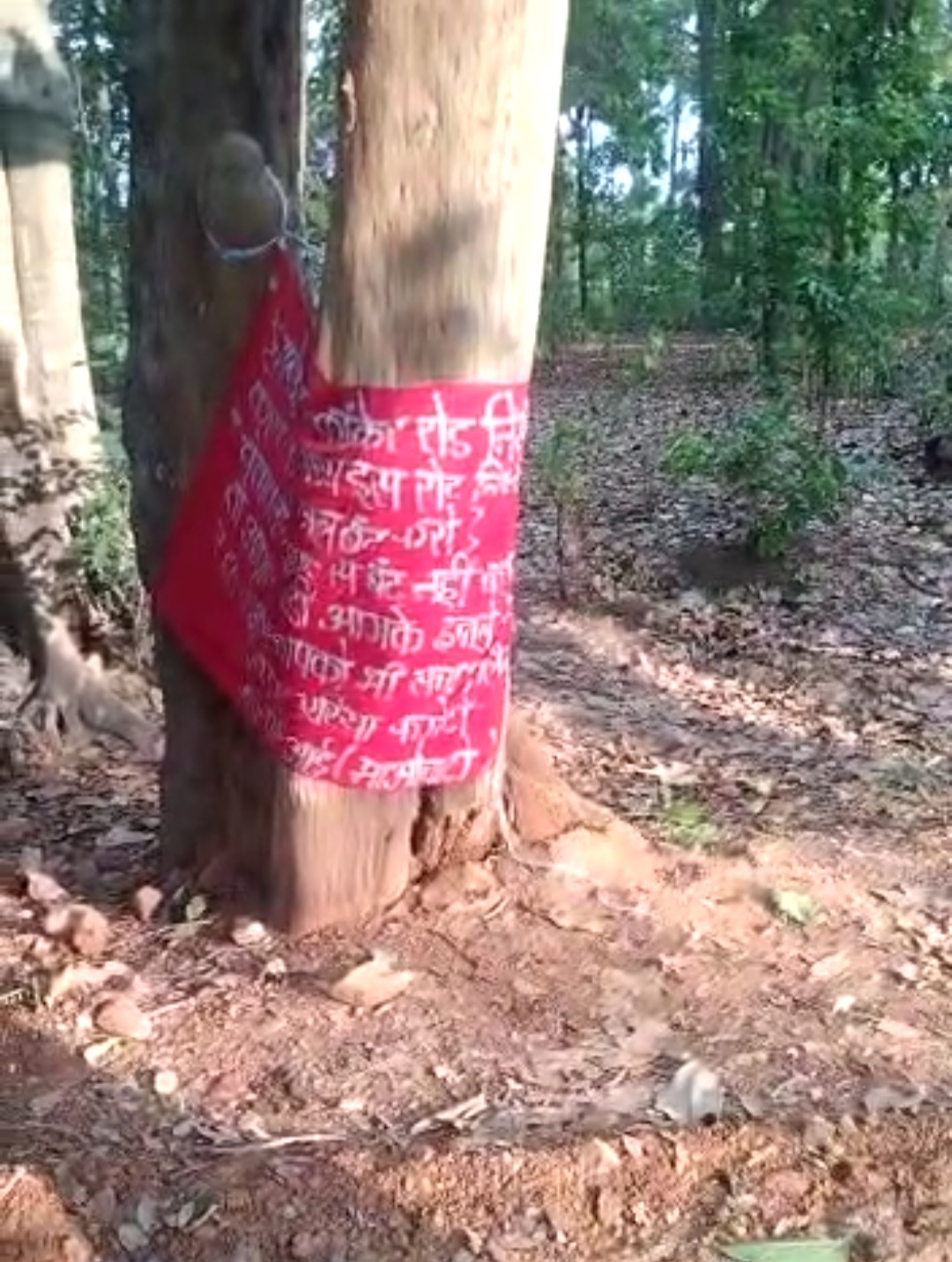 कांकेर ब्रेकिंग- कल जिस जगह पर नक्सलियों ने किया था आईईडी ब्लास्ट, आज उसी स्थान पर बैनर बांधकर दी चेतवानी, कांकेर आमाबेड़ा सड़क निर्माण कार्य बंद करने की चेतावनी, नक्सलियों ने बैनर में दी धमकी, अगर बन्द नही हुआ निर्माण कार्य तो गाड़ियों में करेंगे आगजनी, कुएमारी एरिया कमेटी ने लगाया बैनर।